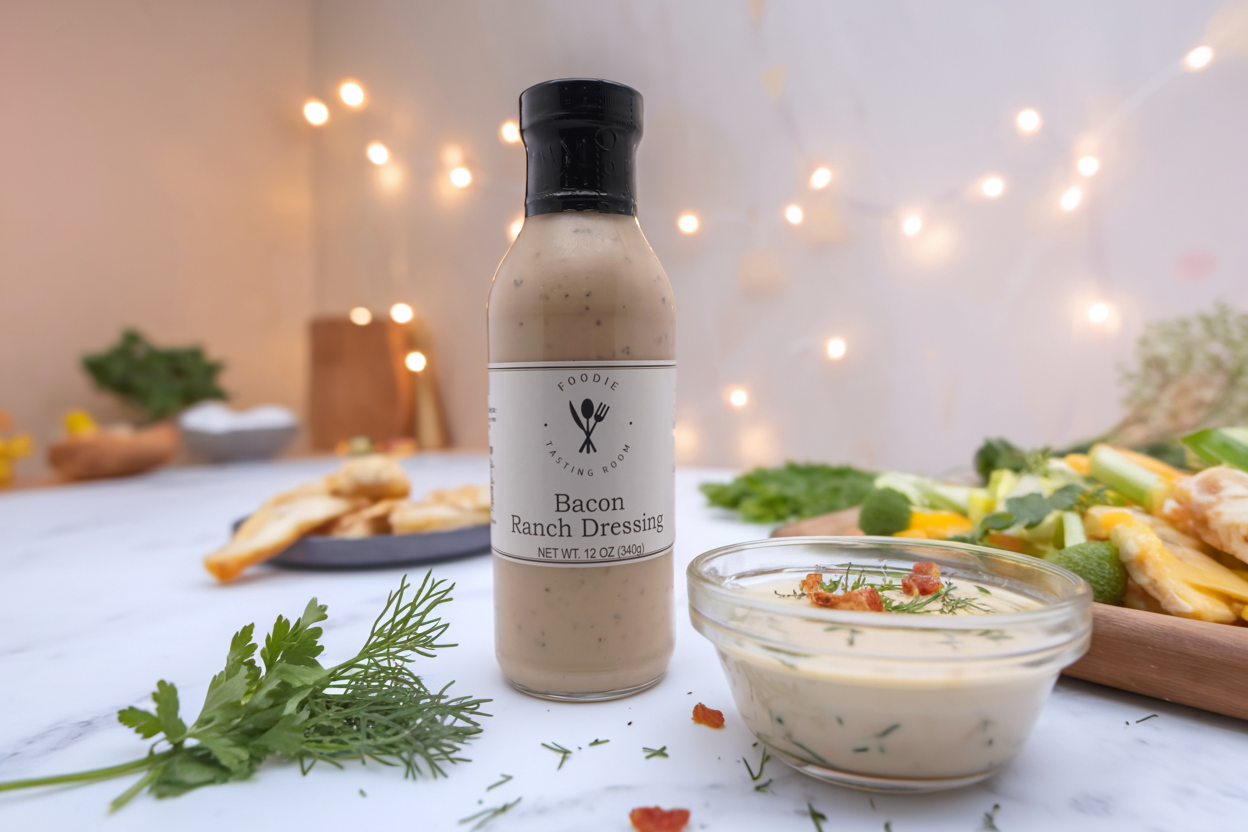 Creamy and full flavored with bits of real bacon, celery, carrot and parsley, our Bacon Ranch Dressing is a fantastic staple to have on hand. With its classic buttermilk tang and ever so slight hint of cayenne pepper, it's great on sandwiches, as a dip and of course, on salads. Our dressings and sauces are crafted in small batches using the freshest ingredients because we love making and sharing our delicious foods.