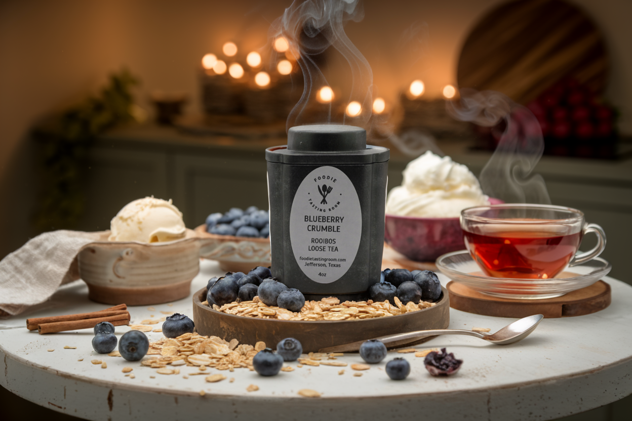 Every blend is woven in house at Foodie Tasting Room, Jefferson, Texas—where organically grown teas, herbs, and fruits are transformed into small-batch fusions of light, spirit, and soulful pleasure.