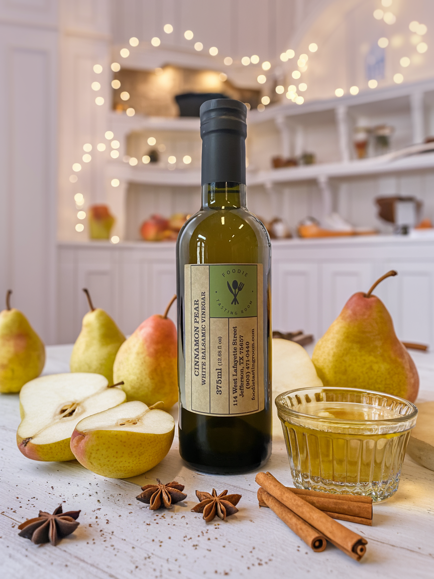 Flavor & Aroma— Cinnamon pear white balsamic vinegar is a comforting blend of warm spice and sweet fruit that feels like a cozy embrace. The flavor opens with the succulent sweetness of ripe, juicy pears, perfectly balanced by the warm, aromatic spice of cinnamon. Subtle caramelized notes emerge, adding depth and richness to the profile. The aged white balsamic brings a bright, tangy layer that enhances the fruit's natural sweetness while harmonizing with the spice. The aroma is captivating, with the earthy warmth of cinnamon mingling with the fresh, floral scent of pears. Its finish is smooth and indulgent, evoking the flavors of a spiced autumn dessert, perfect for elevating both sweet and savory dishes.