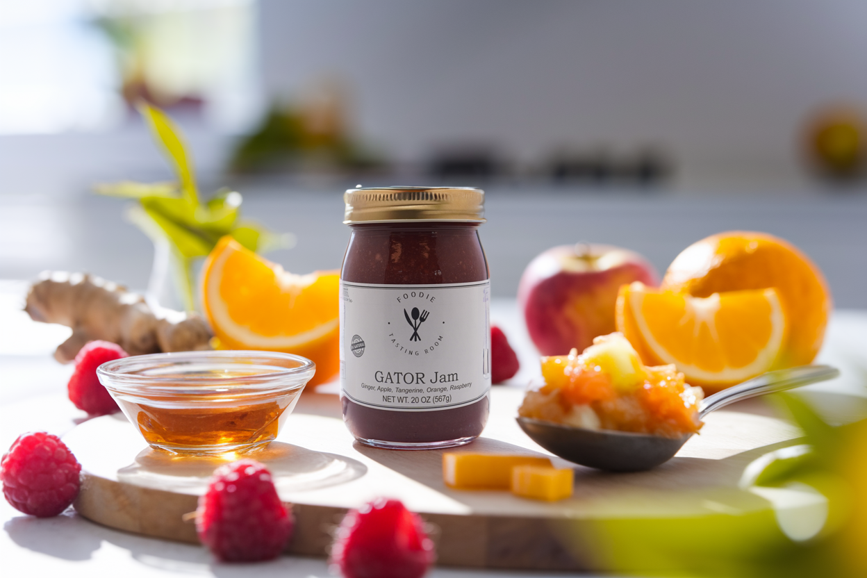 GATOR = Ginger, Apple, Tangerine, Orange, and Raspberry. Sweet, mild heat and absolutely delicious! Slather this on some homemade biscuits and gravy or on your favorite type of bread for a tasty breakfast. Our jellies are crafted in small batches using the freshest ingredients because we love making and sharing our delicious foods. 16oz Jar