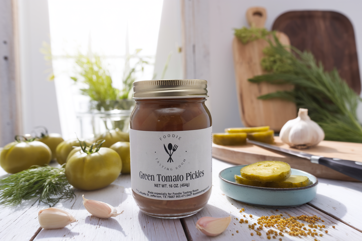 These tomatoes offer a delicious combination of sweet and tart with a distinct bread-and-butter pickle flavor. Pickled green tomatoes with sweet onions, turmeric, and chili flakes for a flavorful addition to burgers and Cuban sandwiches. Our pickles are crafted in small batches using the freshest ingredients because we love making and sharing our delicious foods. 16oz Jar