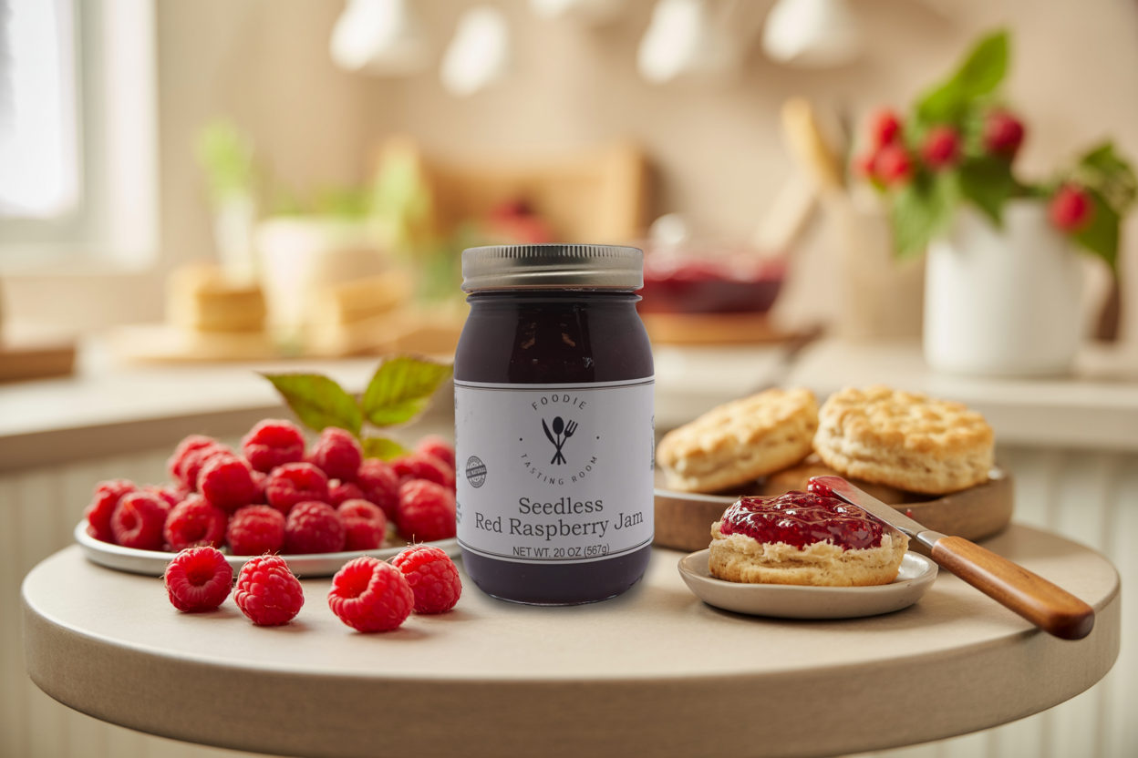 Sun Kissed Red Raspberries are expertly combined with fruit juice concentrate and slowly cooked to perfection. Serve with assorted breakfast bread or use it as a topping for ice cream or cheesecake. Our jellies are crafted in small batches using the freshest ingredients because we love making and sharing our delicious foods. 16oz Jar